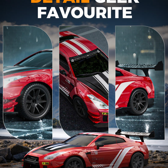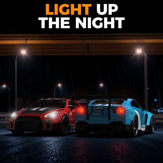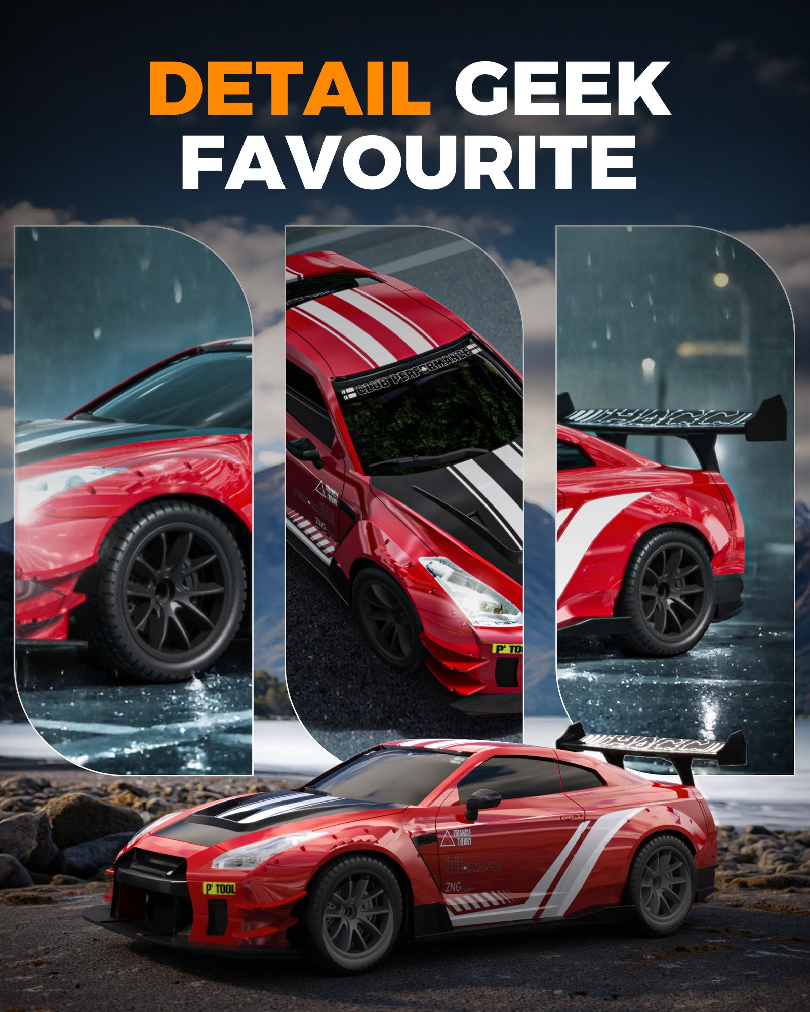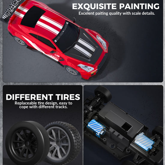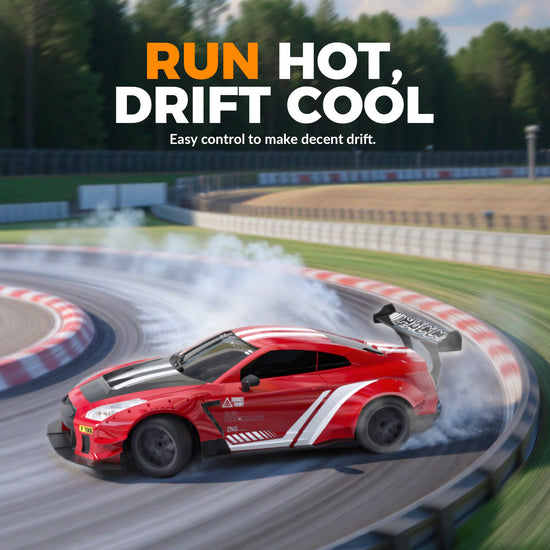 El coche tiene una carrocería resistente para resistir los baches y neumáticos gruesos y duraderos. Puedes correr a toda velocidad o derrapar, deslizándote lateralmente como en las películas, con neumáticos reemplazables para carreras o derrapes. Tiene luces LED brillantes que parpadean al encenderse y un efecto de niebla fría en la parte trasera al presionar un botón en el control remoto, lo que le da un aspecto espectacular, especialmente de noche. - Tiempo de juego y tecnología