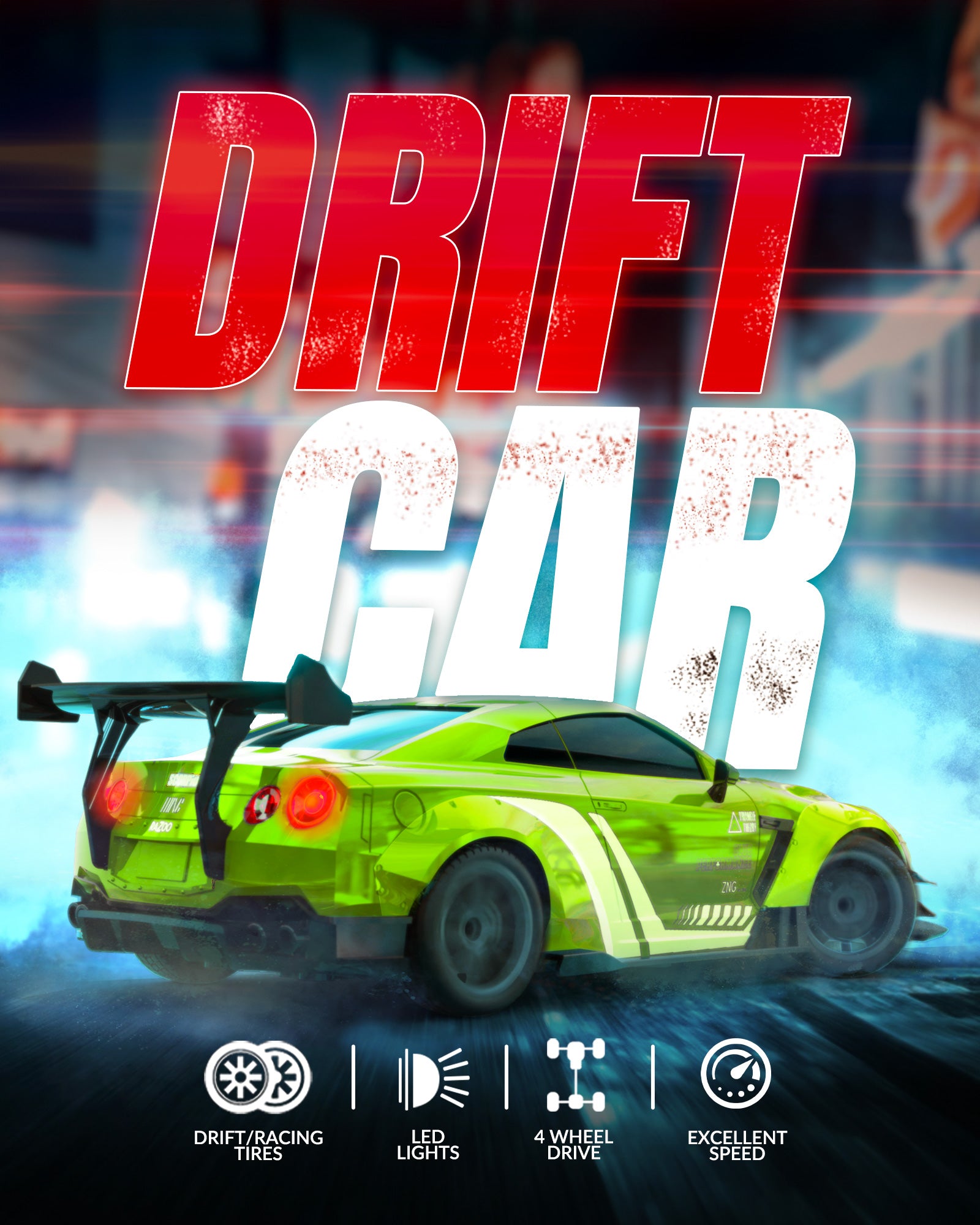 The car has a tough shell to handle bumps and thick tires that last long. You can race fast or drift, sliding sideways like in movies, with replaceable tires for racing or drifting. It has bright LED lights that flash when powered on, and a cool mist effect from the back when you press a button on the remote, making it look awesome, especially at night. -