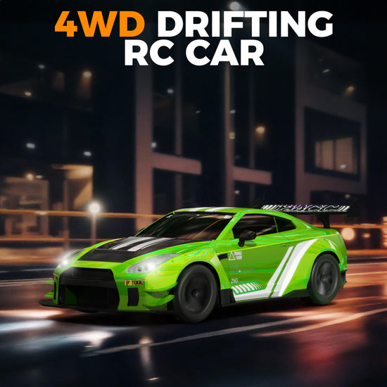 This is a fun 4WD remote control (RC) drift car that goes up to 11 miles per hour, perfect for racing indoors or outdoors. It’s easy to control, moving forward, backward, left, right, and adjusting speed smoothly.